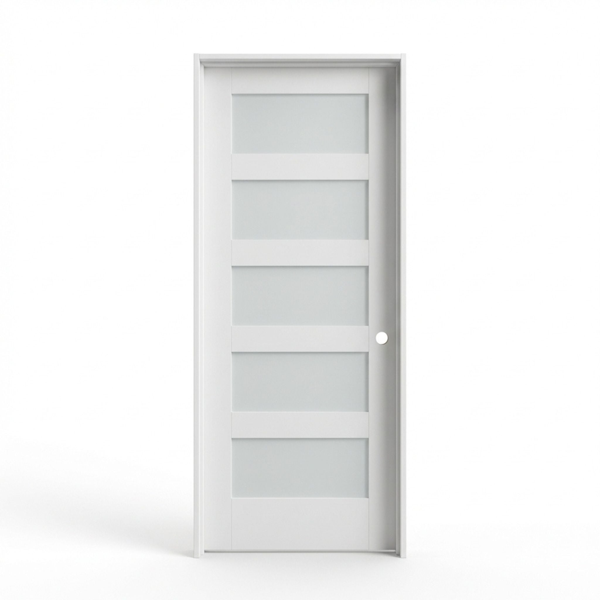 The 5 Lite Frosted Primed Pre-hung Solid Core Interior Door offers a sleek design with frosted glass panels, providing privacy while still allowing soft light to pass through. Its primed surface is ready for painting, making it easy to customize for any room. If you're looking for a solid alternative, the 5 Panel Primed Prehung Interior Door offers a similar design without the frosted glass.